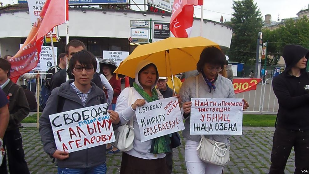 俄罗斯左翼势力2012年6月在莫斯科集会支持哈萨克扎纳奥津石油工人抗议活动,参加者中包括被捕和被打死的石油工人家属。