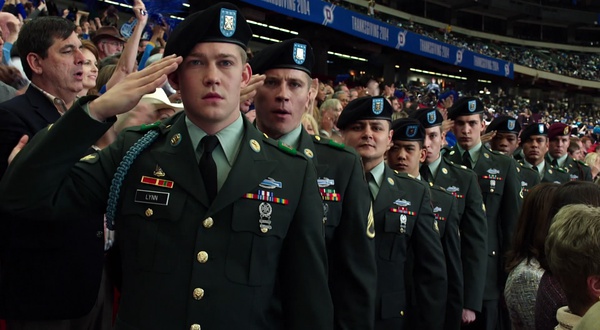 从剪辑上来说,李安以B班士兵参加中场秀的整个过程为时间轴,通过林恩的内心活动带出战场的生活线索,戏剧张力的建立,来自内心与外界的对比。而情节上的铺陈,却并不是那么环环相扣。这是因为他选择的,是意识流的情绪性剪辑,最终达到的,是一种心理分析式的效果,还让人隐隐觉察到一丝暗黑可怖。