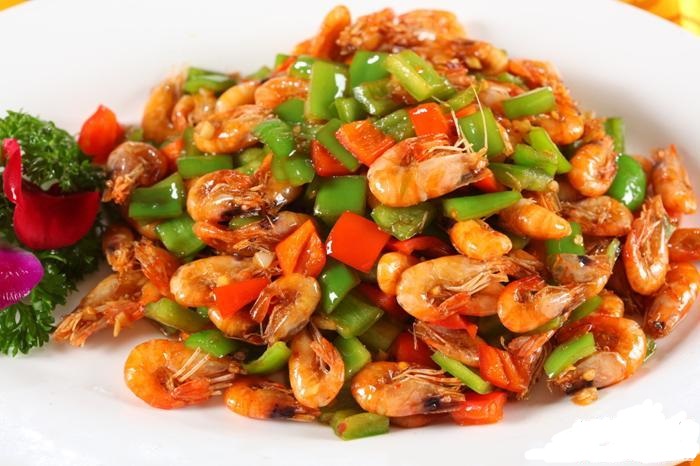 3、锅内放油、姜米炒香,下红尖椒圈入盐,烹陈醋再放入炸焦的河虾;
