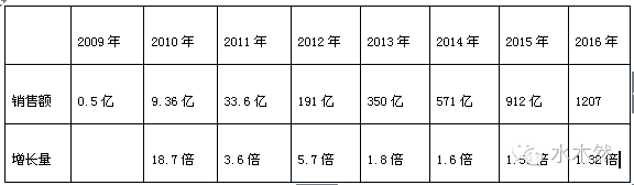如图:也就是说,除了2012年的小波动外,其销售额增长幅度一直在下滑,说明电商的后续增长动力不足了。