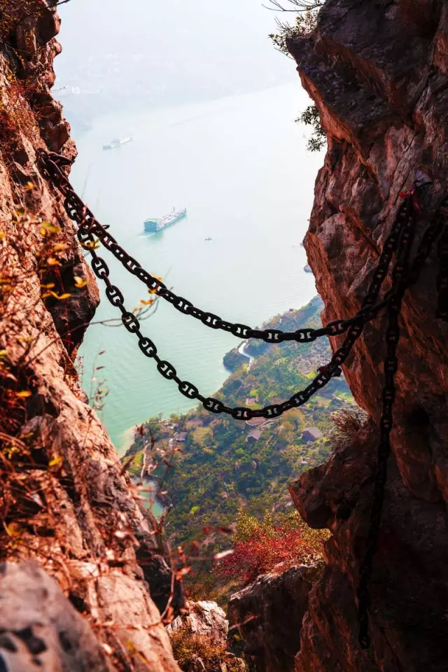 屹立于兵书宝剑峡和牛肝马肺峡之间,因“链子锁崖”而得名。