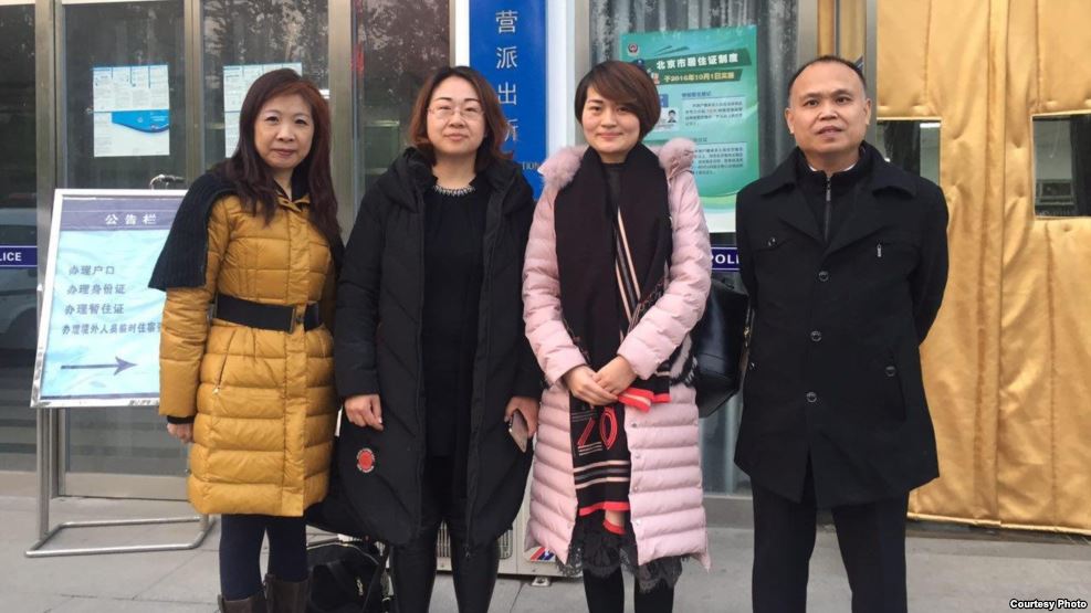 余文生律师(右起)、李文足、王峭岭等在派出所外(参与网图片)