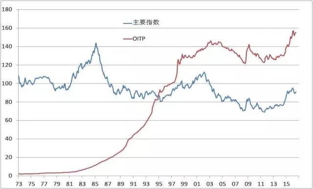 王晓东专门研究了1973年年初至今的美元指数(major,指对欧元、日元、英镑等7个主要国际货币)的走势,发现美元指数至今只贬值了15%左右;但对中国、俄罗斯、印度、巴西、南非、墨西哥等约20个国家货币的美元指数(OITP)同期升值却超过70倍。尽管相对于major国家,OITP国家的经济整体上蓬勃向上,但汇率却无一例外地出现超大幅度贬值。