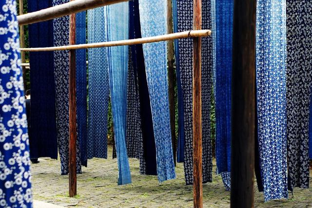 在古老的手工染坊前,一根根竹竿高挑着整匹蓝色印花棉布从天而降,令人感到震撼。一阵风恰好吹过,布上的一朵朵典雅而热烈的花开始跳跃着舞蹈,一个亲切、神秘的世界悄然为你打开。
