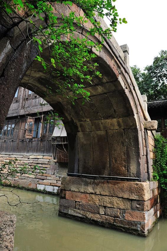 有河必有桥,乌镇的桥主要以石板桥为主。石板桥都是拱形的,在桥的半圆形桥洞上往往写着桥的名字。桥,对所有人来说是再熟悉不过了,可乌镇的桥并不是那么普普通通,而是饱经风霜。桥上雕刻的花纹已经模糊不清,几棵有顽强生命力的小草在石缝里茁壮成长。走上石桥,迎面吹来了一阵微风,让人感到清爽自在。