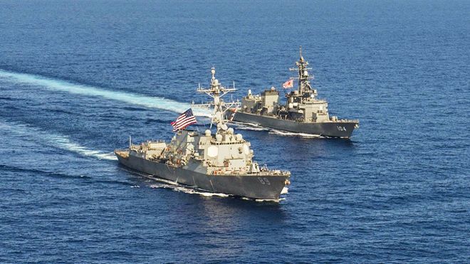 美日两国军舰2015年4月在南中国海演练。(资料图片)