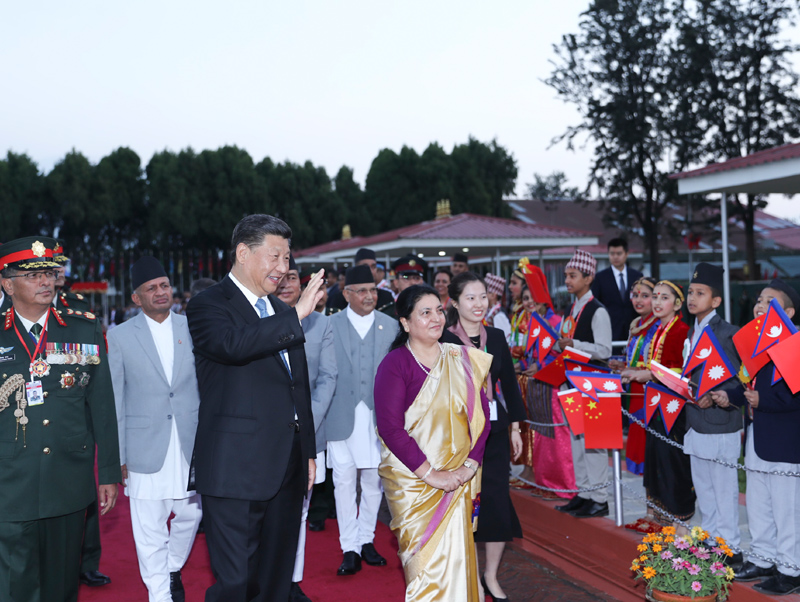 美联社说,习近平在机场受到尼泊尔女总统班达里(Bidhya Devi Bhandari)和总理奥利(Sharma Oli)的迎接。