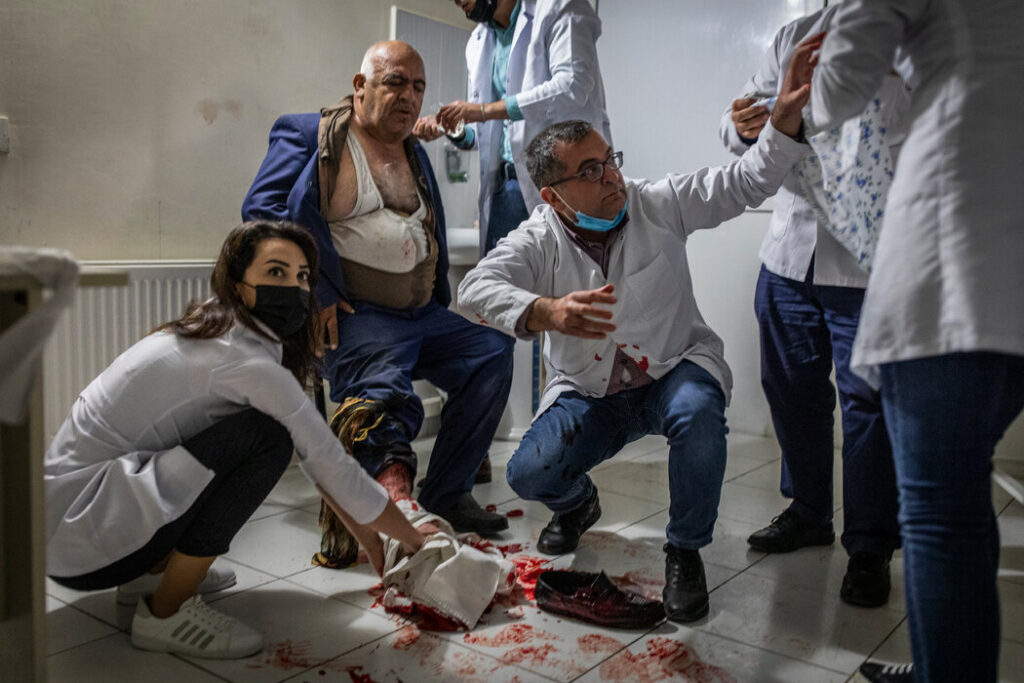 阿塞拜疆巴尔达——第一次爆炸声大到足以让我们停下车来。它似乎很近,听起来像是火箭弹的声音,所以我们迅速跳出来,蹲在墙边。我后来意识到,如果没有停下来,我们可能会径直开进一个爆炸地点,就在前方不到20码处。周三发生爆炸时,我们正驱车沿着阿塞拜疆巴尔达省的主要街道前往一个十字路口。阿塞拜疆正在与亚美尼亚交战,但前线在20英里之外,这里的生活在平静地继续。女人在外面购物,男人在加油站给汽车加油。接着,一串震耳欲聋的爆炸声接连而来,似乎每一声都更近、更响。一个女人开始尖叫。一个男人对家人大吼。他们拐过街角,他的妻子把一个孩子的衣袖扯断了,他们冲进一条小巷。马路对面,鲜血染红了一家私人诊所地下室门前的台阶。诊所里,一名腿部大量出血的出租车司机正在接受治疗。护士、病人和路人挤在地下室里,绕过血泊,用手机给家人打电话。