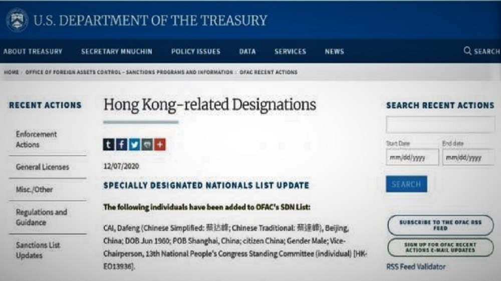 美国财政部网站12月7日公布,就香港4名泛民议员被取消资格,制裁14名全国人大代表。