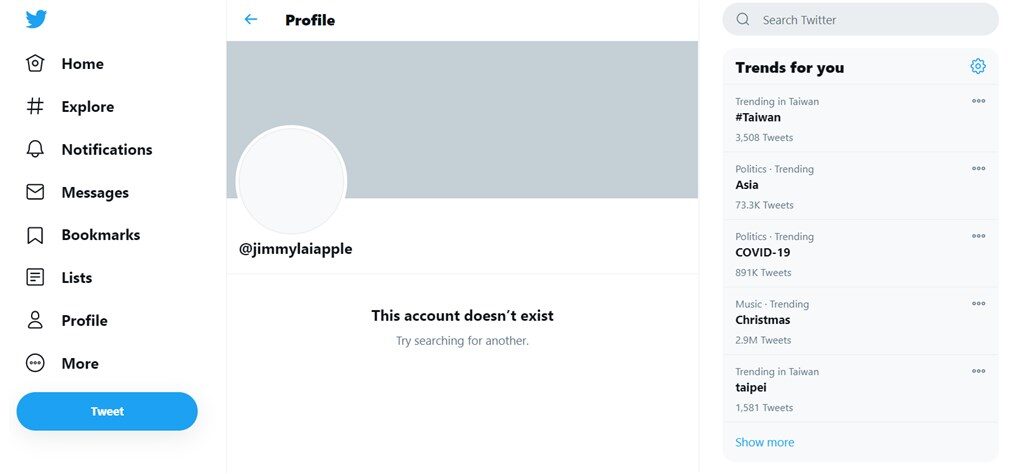 今天在推特搜尋黎智英的帳號@JimmyLaiApple,顯示「此帳戶不存在」。