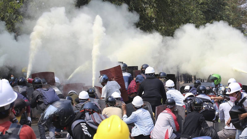 目擊者表示,緬甸安全部隊今天在仰光兩個地方包圍反對軍事政變的數百名抗議民眾,逮捕上百人,並發射催淚瓦斯,促使美國大使館呼籲軍警撤離。