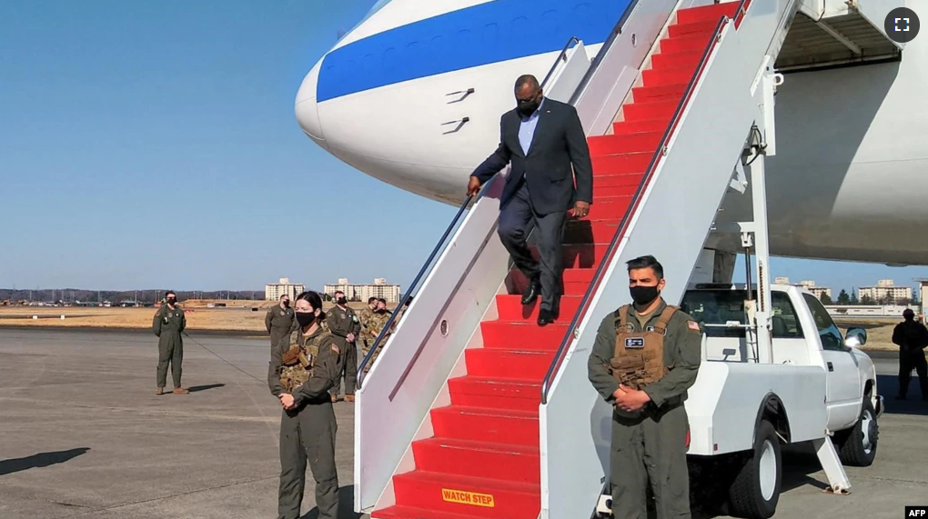 美国防部长奥斯汀在东京的横田美国空军基地走下飞机。(2021年3月15日)