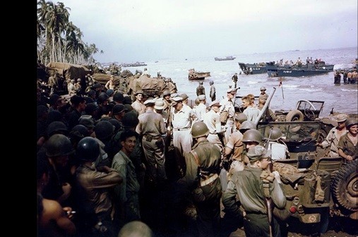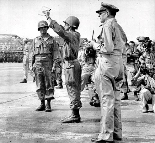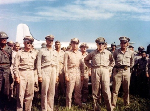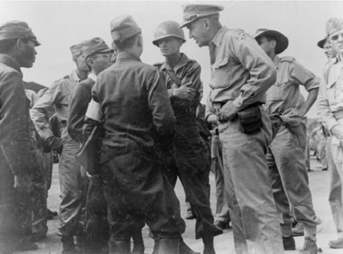 手执长枪的空降兵们,目击头戴钢盔的斯维因少将,与麦克阿瑟和他的随从一起合影。麦克阿瑟微笑转身,对着艾克尔伯格将军说:“鲍勃,从墨尔本到东京,这条路漫长而艰难;正如他们在电影里说的,这叫回报。”