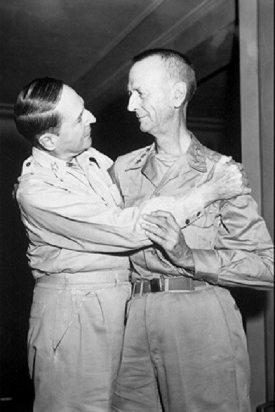 第二天晚餐时辰,一名副官宣布乔纳森·温赖特将军的到来。1942年,罗斯福总统下令把麦克阿瑟调往澳大利亚后,温赖特中将接过保卫菲律宾科雷希多岛的重任。仪仗队的埃尔马廷格中尉,看见孱弱的温赖特将军,柱着一根战前麦克阿瑟赠送给他的拐仗走进来。温赖特将军守卫科雷希多岛失败后投降,当了3年日军俘虏。他一直以为,因为投降,他在美国会被视为失败者。可是,麦克阿瑟惺惺相惜,把温赖特将军视为凯旋归来的英雄。天知道,如果不是奉命转战澳洲,他自己没准就会像温赖特将军一样成为日本帝国的阶下囚——东亚历史也要改写。见面时,麦克阿瑟忍不住热情地拥抱瘦骨嶙峋的温赖特中将。问候之后,他告诉温赖特:“嗨,吉姆,你原来的队伍还归你指挥。”