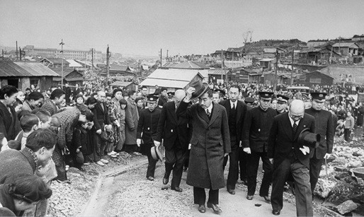 第11空降师的斯维因少将,早巳捷足先登。5点30分,麦克阿瑟入驻新大饭店,斯维因则把指挥部选定靠近横滨赛马场的“旭日石油公司”大院(麦帅搬进新大饭店前曾经一度考虑把他的总部设在这里)。横滨当时基本上已是一座鬼城。5月29日,美国空军燃烧弹袭击后,这座城市的80%被夷为平地;现在剩下的全部是在原有废墟上建起的水泥砌块小屋;空降兵们一个劲地对眼前景象摇头。市区被大火烧剩的房屋,统统钉上了木板,店铺窗口无玻璃。美军士兵经过的时候,街头零星少徐留下的市民,要么对着他们脸无表情地弯腰鞠躬,要么木纳地摆摆手;四周围的一切,给人一种超现实感。