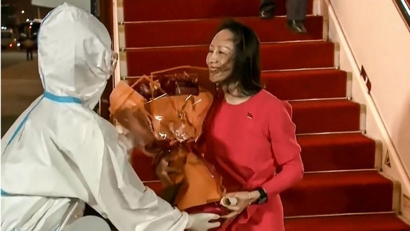 在康明凯回家前一天,美国检察官允许孟晚舟离开加拿大,然后她回到家乡,并在那里身穿一套亮红色衣裳接受英雄式欢迎。