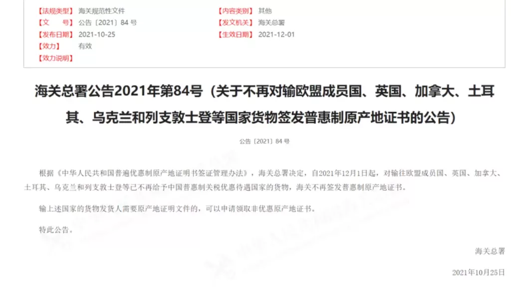 中国海关总署上月28日在官网发布公告,指根据《中华人民共和国普遍优惠制原产地证明书签证管理办法》,12月1日起,停止签发输往有27个成员国的欧盟、英国、加拿大、土耳其、乌克兰、列支敦士登「普惠制」原产地证书(Form A),间接证实欧盟等32国取消中国的贸易优惠待遇。