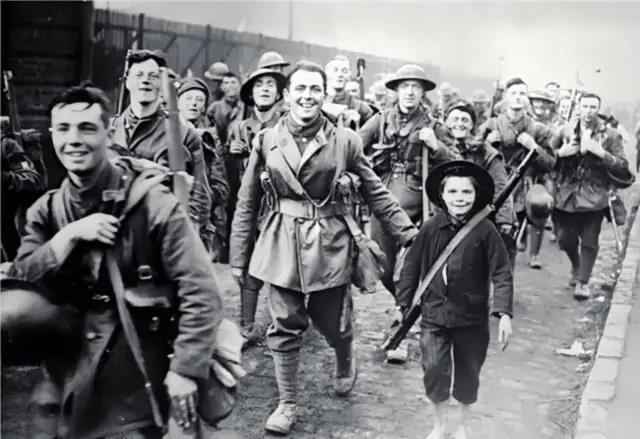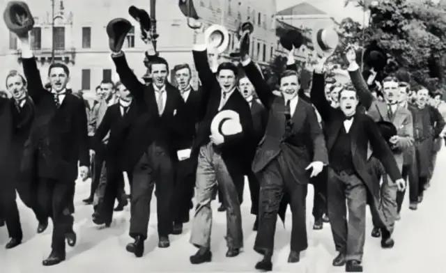 尤其是年轻人,他们亢奋得要发狂了,深恐自己会错过这场战争。在英国,19岁才让参军,孩子们就谎报年龄,成群结队地往军营里跑。他们觉得战争是一件酷酷的事情。