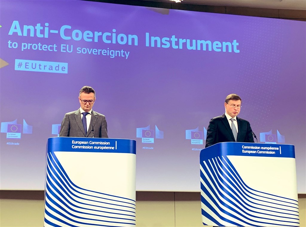 歐洲聯盟貿易執委杜姆布羅夫斯基斯(Valdis Dombrovskis)召開記者會,宣布今天提出「保護聯盟及其成員國免受第三國經濟脅迫」措施,未來會透過徵收關稅和限制相關國家貨物進口,甚至限制相關國家在歐盟的投資等措施,以應對歐盟及其成員國近年來成為第三國經濟施壓的目標。