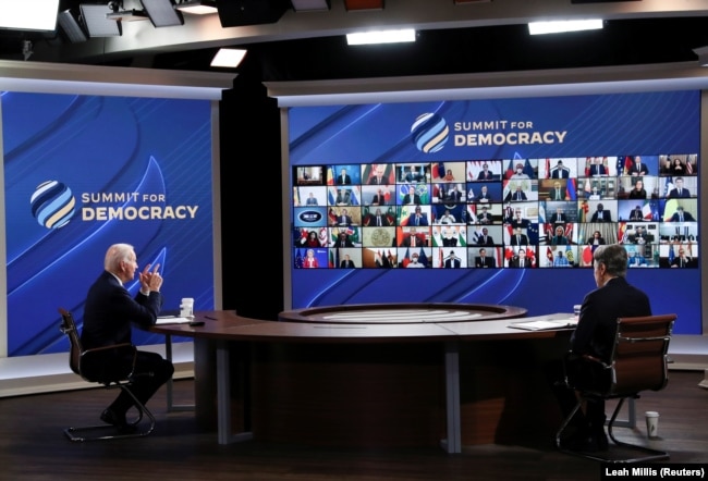 美国总统拜登召集全球110个国家的政府以及公民社会和私营部门领导人出席的线上“民主峰会”星期四上午拉开帷幕。拜登总统在国务卿布林肯的陪同下发表了开幕词。