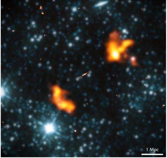 图为Alcyoneus星系,左下及右上两片橘色的是电波瓣,上下长达1,630万光年。(图/翻摄自台北市立天文科学教育馆官网)
