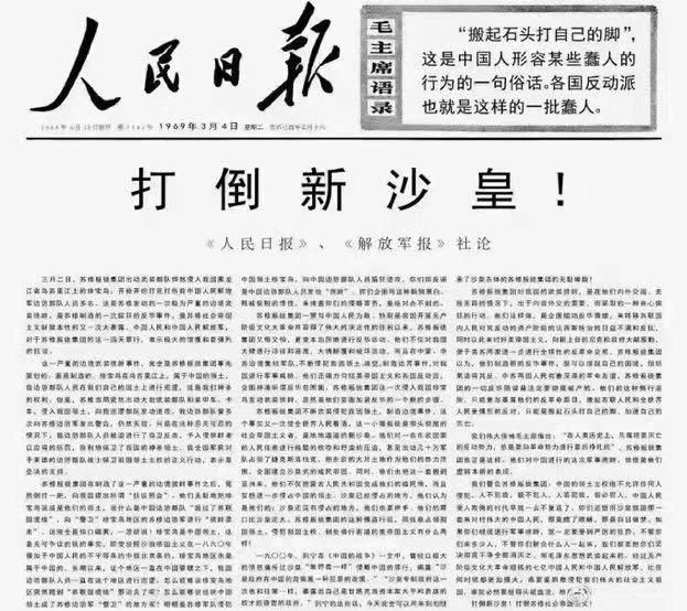 有网民翻出1969年3月4日,中苏交恶时期《人民日报》、《解放军报》头版社论,题目是《打倒新沙皇》,籍此批评俄罗斯入侵乌克兰。 不少网民留言,提醒中国真正的敌人是北方的俄罗斯。