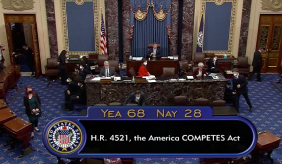 参议院星期一傍晚以68票赞成、28票反对的表决结果通过了经参议院修改的《美国竞争法》(America COMPETES Act)。法案接下来将送回众议院展开协商会议,并再次进行表决。