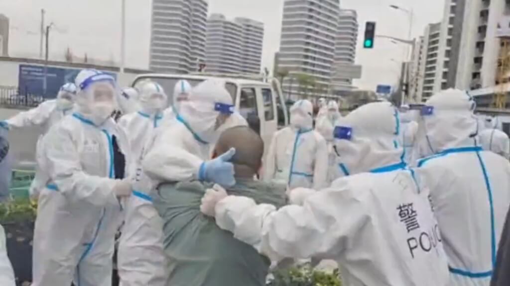 在上海,不断蔓延的疫情让当局试图征用公寓作为临时隔离设施,但这让许多居民感到不满。在罕见的抗议爆发后,身穿防护服的警察用武力驱散了抗议者。