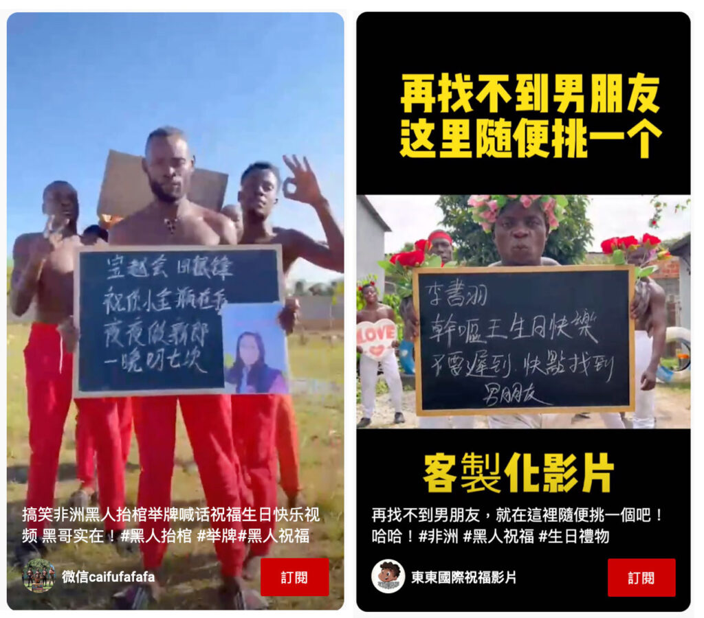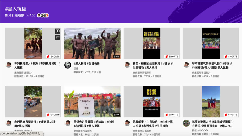 果不其然,以“黑人祝福”搜寻,网上仍有大量“客制化”短视频,如“搞笑非洲黑人抬棺举牌喊话祝福生日快乐”,另有一群黑人打赤膊,拿着中国老板的相片,举牌写着“xx老板威武,我们永远爱你,by苏州办公室”等等。