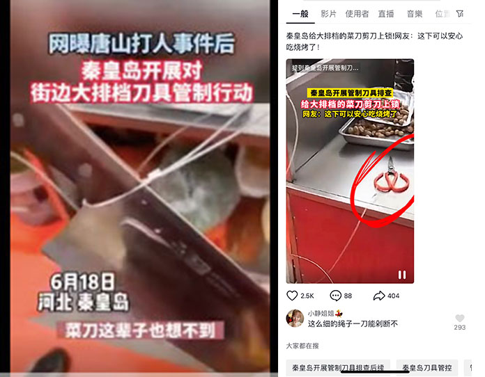 在抖音平台,网民“小鹏见解”评论说,把菜刀剪刀绑起来,让他想起元朝:“这让我想起了元朝统治时期,元朝怕汉人造反,没收了铁器,切菜要几个家庭共用一把菜刀,现在是新中国,难道在我们党的领导之下,还不如一个封建的元朝吗,一个14亿人口的国家......”