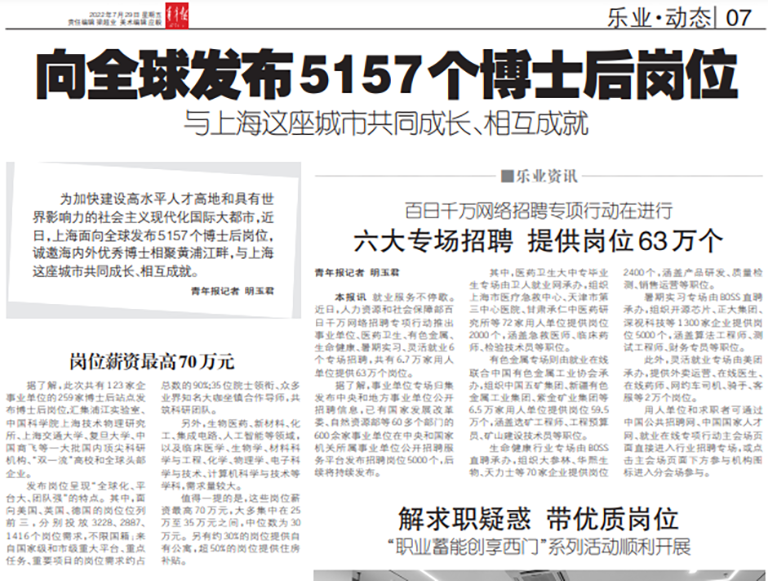光明网在报道上海招募博士后的消息时,用了“C位以待”的标题,并且强调,这些招聘单位都是具有国际国内领先水平的高端科研平台。