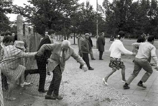 13日下午,柏林墙树立以后,一幕震撼人心的情景出现了:一个青年在光天化日之下,用百米冲刺的速度飞奔向铁丝网。但是,三名东德警察追上了他,将他打倒在地,谁也没有想到,被打倒的他竟奇迹般又站了起来,夺过警察的枪,一边与警察对峙一边继续向西柏林飞奔。警察冲上去和他又一次扭打成一团,并一刀刺进青年人的膝盖。这个年轻人失去了奔跑的能力,面对三个警察,结局已经注定。然而,西柏林群众发出雷鸣般的怒吼,惊醒了三名警察:他们已经越过了柏林墙,现在是在西德的土地上,他们不再是警察,而成了违法者。他们慌忙扔下青年跑回柏林墙的另一侧。青年拖著残废的腿,一边拼命呼救一边爬到了西柏林。