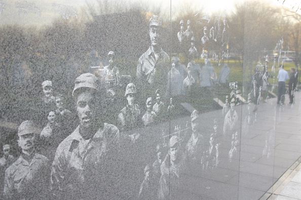 纪念墙的花岗岩是磨光的,开阔地的塑像群因此而映射在墙上。随著我们的脚步移动,两组形象便流动地,互为背景地融合在一起。战场的引入,新闻照片的应用,都表明著设计者在刻意寻求一个历史真实的感觉。而正是设计者的这个追求,让走入纪念碑园区的我们,不无困惑。