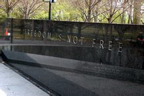 很难在纪念碑上直接找到彻底的答案,因为这个纪念碑园区的文字非常少。除了上面这段碑文,另外,就只有一句话的碑文了,那是用银色的字,镶镌在一座同样简洁的黑色花岗岩纪念碑上的。纪念碑座落在一个圆形的水池中。它是整个朝鲜战争纪念碑的主题:“自由不是无代价的。”虽说提到“自由”这样一个“主旋律”,可是整个设计基调仍然是低沉的。和越战纪念碑一样,它强调的仍然是“代价”,是战争对于生命的摧残。因此,作为对主题的诠释,在围起这个水池和纪念碑的石块上,我们看到刻着参与朝鲜战争的联合国军的伤亡记载: