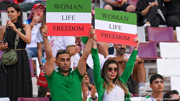 在座无虚席的哈里发体育场中,所有人都在等待场上的球员们有所表示,他们被视为是被大多数人鄙视政权的代表。与妻子一同来到球场的阿雷夫希望伊朗队能发出明确信号。“球员们应该做些什么。即使这对他们会有危险。”脸上画着伊朗国旗的奈玛补充说:“我们期待他们今天就能发出信号。”