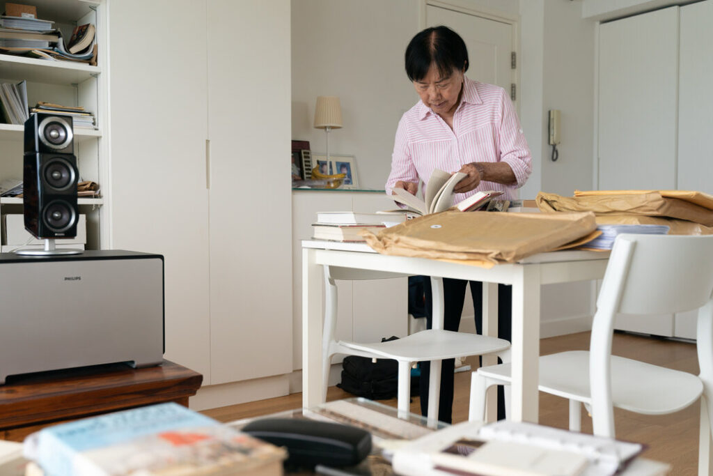 他说,陈元珍和其他人一样,不得不“在差不多是除了自己的记忆之外几乎没有其他资料”的情况下写回忆录。陈元珍回忆录中的许多情节来自她和丈夫多年前的著书和更早的手稿。最近,在港岛南侧一个阳光明媚的小公寓里,她站在堆满了书籍和旧手稿的桌子前。