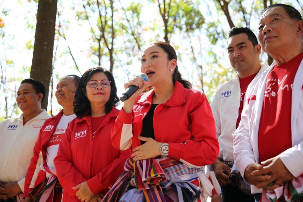 泰國前總理戴克辛的女兒貝東塔(持麥克風者),可能代表為泰黨角逐2023國會選舉的總理大位。圖為貝東塔1月15日在烏隆他尼府參加政黨活動。