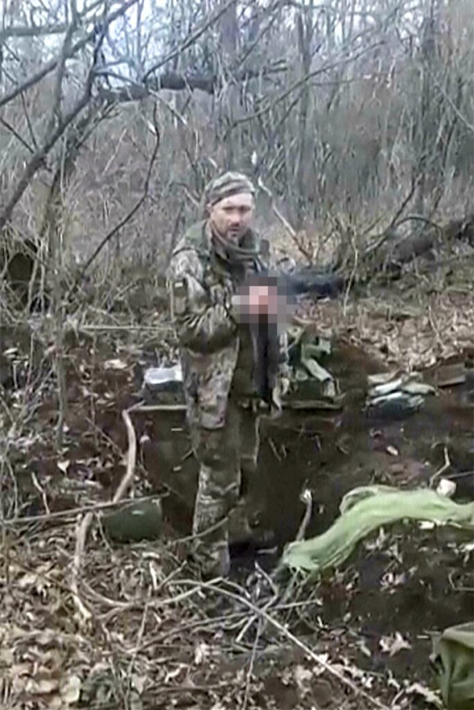 法新社報導,影片內容似乎顯示,一名被俘的烏克蘭戰士站在淺溝中抽著菸,當他說出「榮耀歸於烏克蘭」時遭以自動武器射殺多槍。