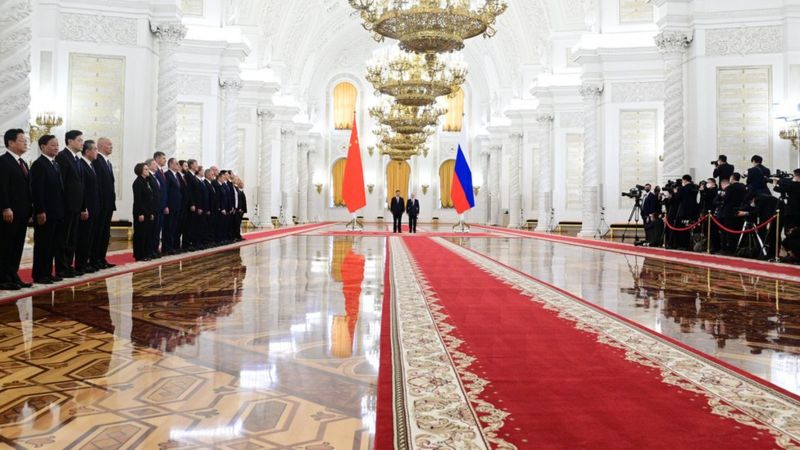 俄罗斯总统普京(Vladimir Putin)在莫斯科克里姆林宫以红地毯欢迎来访的中国国家主席习近平,并举行正式会谈。双方在会后联合声明中强调要“通过和谈”来解决乌克兰危机。