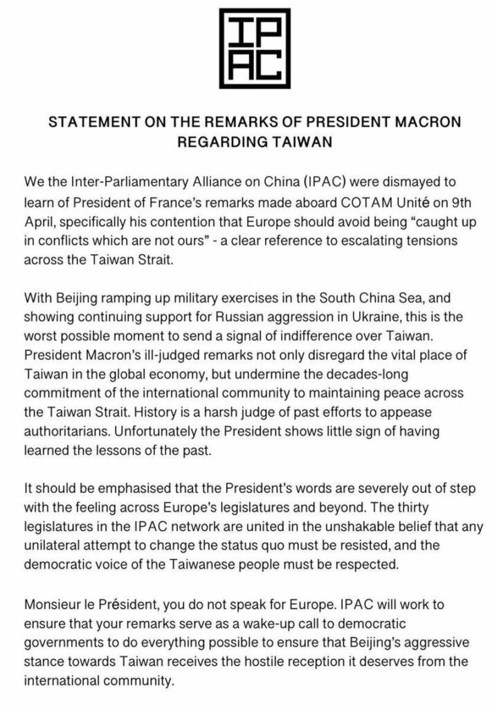 由全球五大洲各國國會及歐洲議會成員共同倡議成立的跨國平台IPAC,今天對此事發表聲明。IPAC表示,IPAC對馬克宏的言論感到震驚失望,特別是談及台海時關於「歐洲應避免捲入不屬於我們的衝突」的論點。IPAC指出,北京在南海加劇軍事演習,並繼續支持俄羅斯對烏克蘭的侵略,這是發出漠視台灣訊號的最糟時刻。
