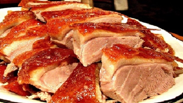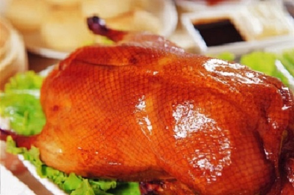 - 6用390°F的温度烤5分钟,然后用320°F的温度烤40分钟,将鸭子烤至全褐色,出炉的鸭子好像涂了亮漆一般,最后在鸭子上刷上麦芽糖再烤5分钟即可。