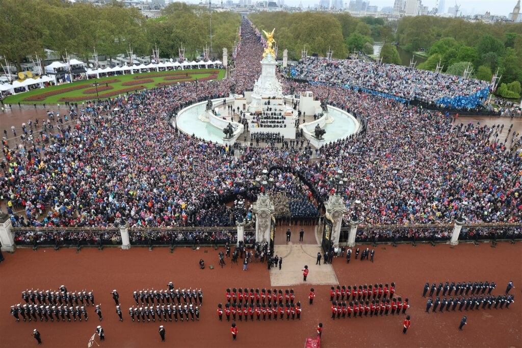 英王查爾斯三世6日加冕,慶典壯盛軍容70年來僅見,吸引人潮湧入白金漢宮周邊。(英國國防部提供)中央社記者陳韻聿倫敦傳真 112年5月7日