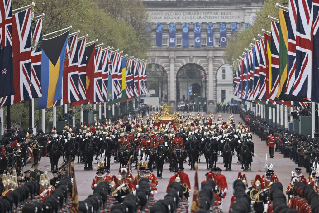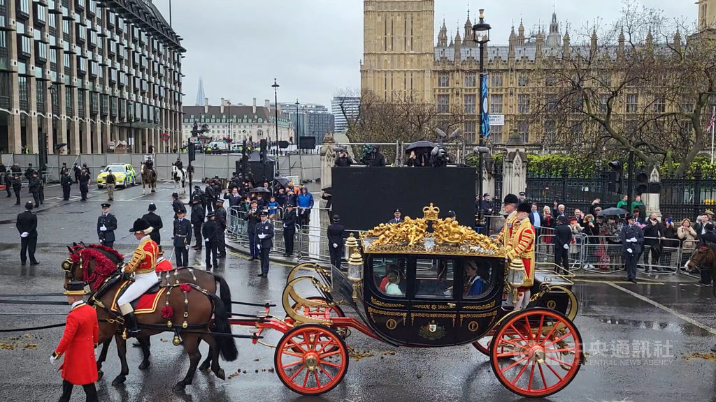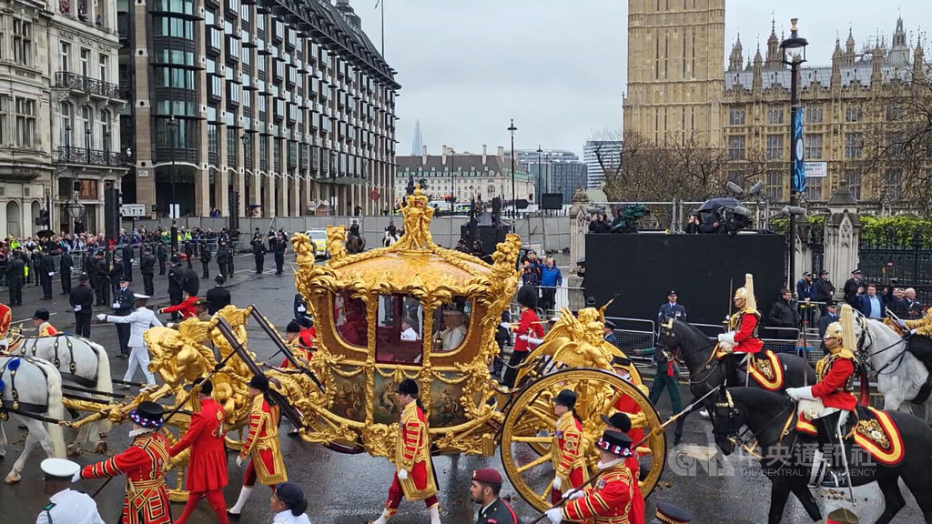 英王查爾斯三世6日於西敏寺加冕後,與王后卡蜜拉同乘君主及其配偶專用的「王室金馬車」返回白金漢宮。上一次王室慶典使用金馬車是2022年6月女王白金禧。馬車歷史可追溯至1760年,並自1831年以來,用於每次君主加冕。中央社記者陳韻聿倫敦攝 112年5月7日