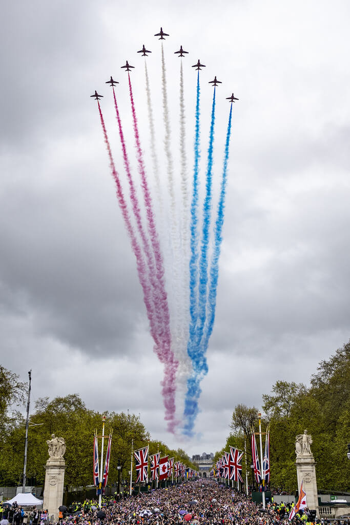 英王查爾斯三世加冕慶典6日舉行,空軍特技飛行小組「紅箭」展演空中分列式,飛越在白金漢宮前林蔭大道上的群眾。(英國國防部提供)中央社記者陳韻聿倫敦傳真 112年5月7日