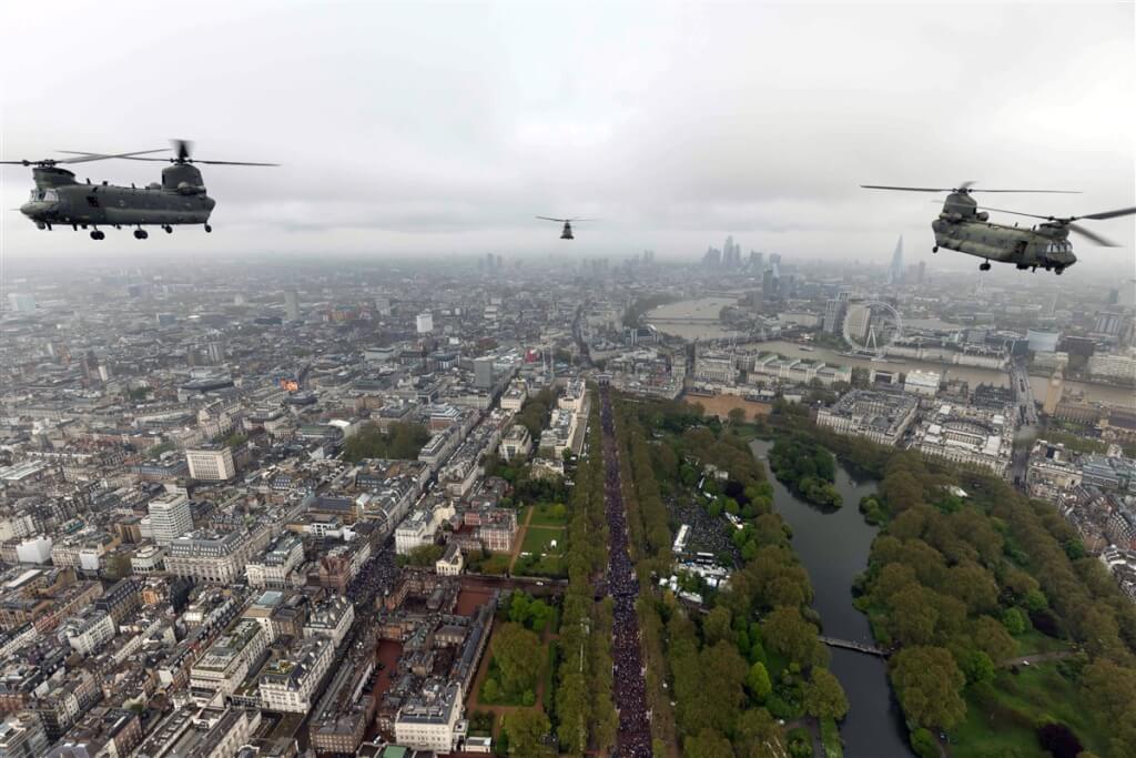 英王查爾斯三世6日加冕,空軍出動2架契努克直升機(左、右)和1架美洲獅直升機(中)展演空中分列式,飛越倫敦上空。(英國國防部提供)中央社記者陳韻聿倫敦傳真 112年5月7日