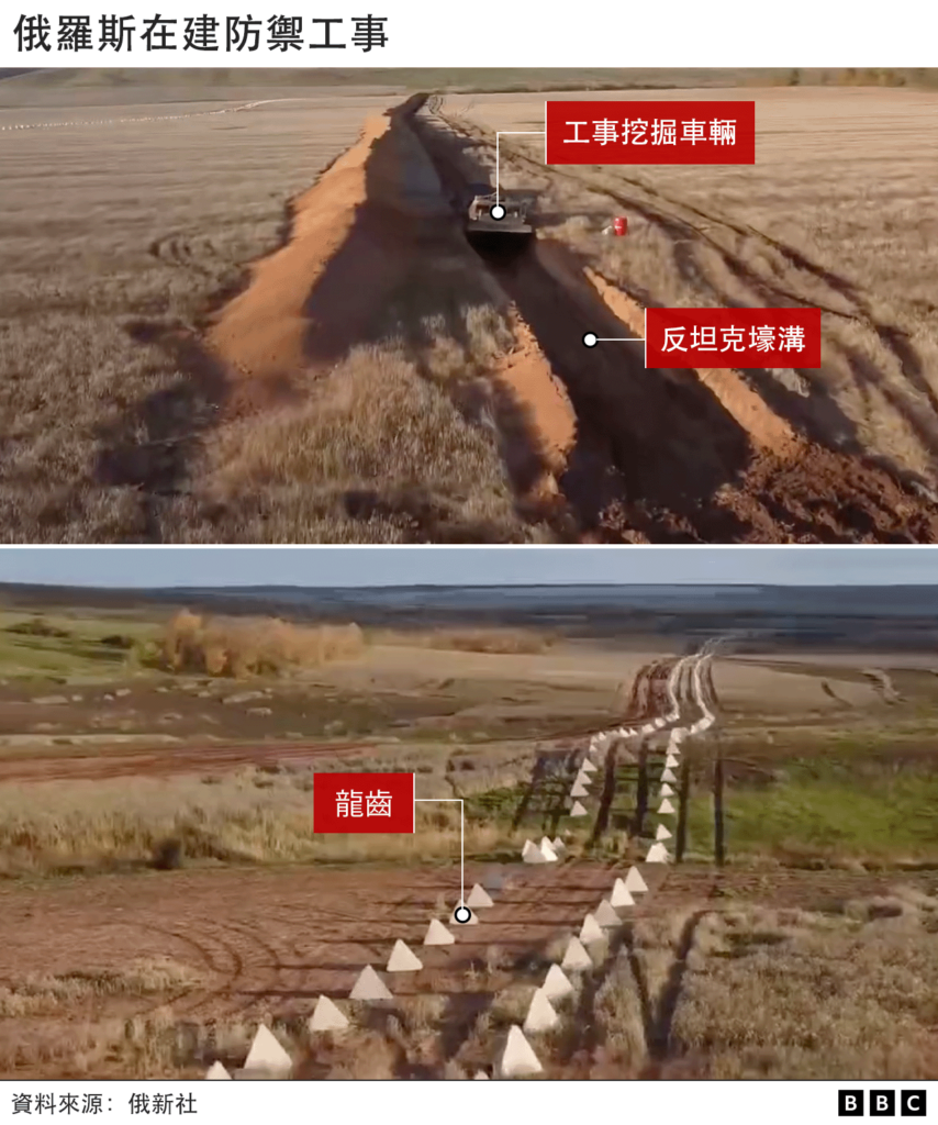 马克·坎西安对BBC分析:“俄军担心最近建立的乌克兰装甲部队。如果这些部队能够进入主要公路,它们便可以非常迅速地行动。”他又说,“俄罗斯的防御工事旨在将敌方坦克从公路上推开,减缓它们的速度。”