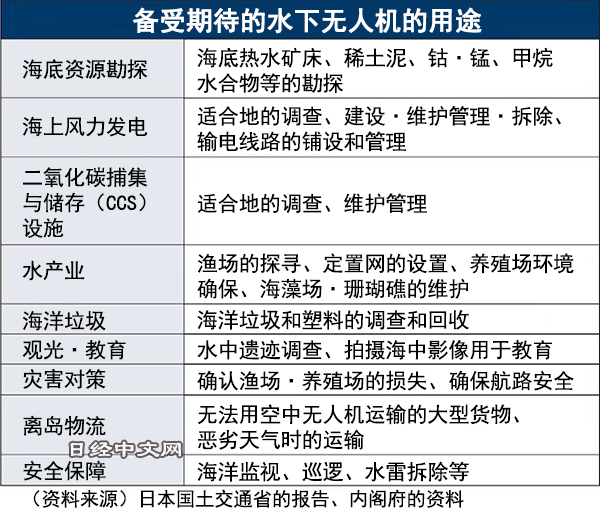 日本的专属经济区有对高科技产品不可缺少的稀土类、钴及锰等资源。海上风力发电是脱碳社会不可或缺的要素。为了稳定确保工业产品、能源及水产资源,日本把水下无人机定位为“有利于经济安全保障的重要技术”。