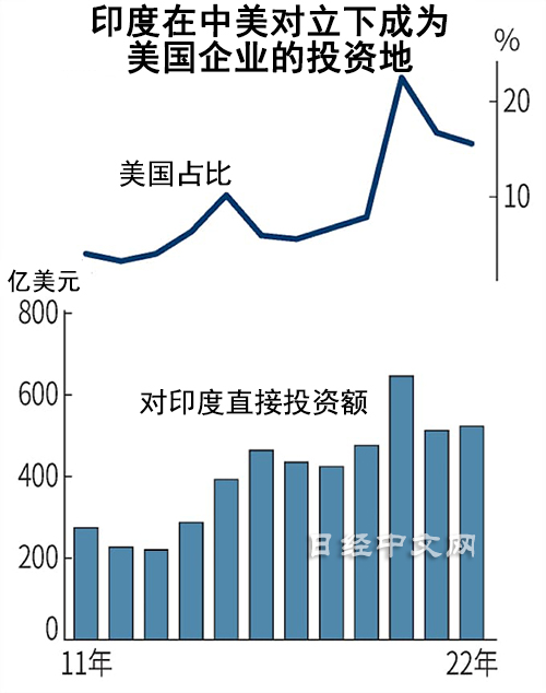 为了取代不明朗的中国业务,印度市场对美国企业的重要性越来越高。从面向印度的国外直接投资数据来看,2020年在接收投资总额中美国的占比为22%。2022年仅次于新加坡,排在第2位。如果包括经由开曼群岛等的投资,美国企业的投资有可能更多。