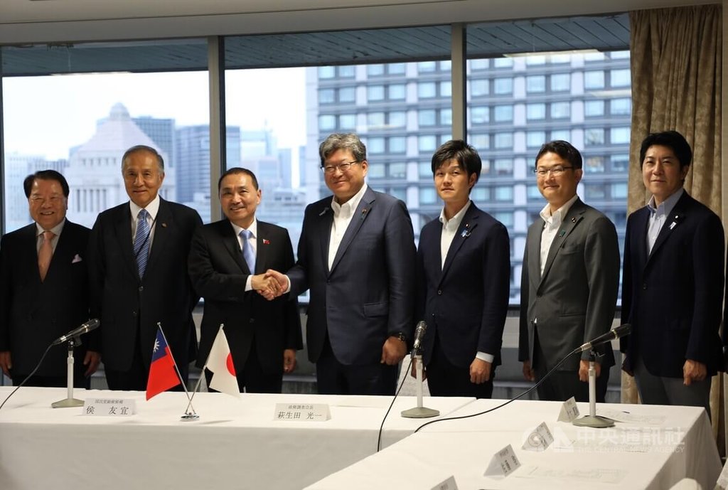 侯友宜、前駐日代表馮寄台一行人今天下午拜會自民黨總部,自民黨政調會長萩生田光一、自民黨青年局長鈴木憲和、青年局長代理藤原崇、青年局長代理佐藤啟、青年局國際部長中曾根康隆與會。
