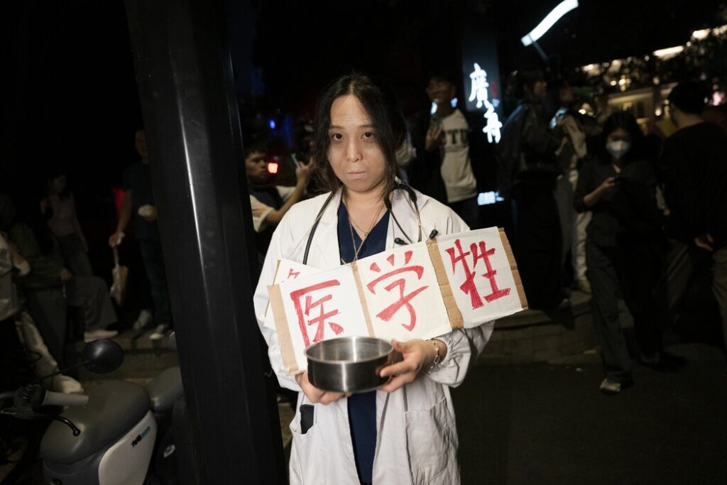 一名女子戴着写有“文科生”的牌子,手拿金属碗和用来讨饭的二维码。另一个女子打扮成一个忍饥挨饿的医学院学生,也拿着一个碗乞讨。